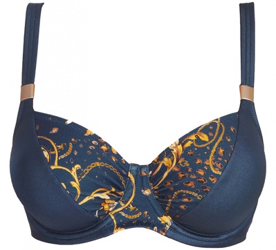 Бюстгальтер купальный, мягкие чашки на каркасах с двойным диагональным членением. Бретели отстёгиваются на спине.