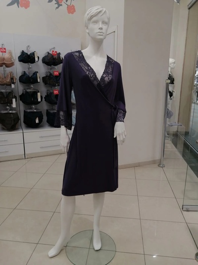 Красивый халат выполнен из трикотажного вискозного полотна декорирован кружевом. Пояс-бант фиксируется в области талии. Рукав 3/4, низ оформлен широким эффектным кружевом.