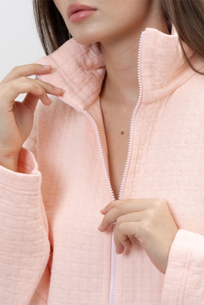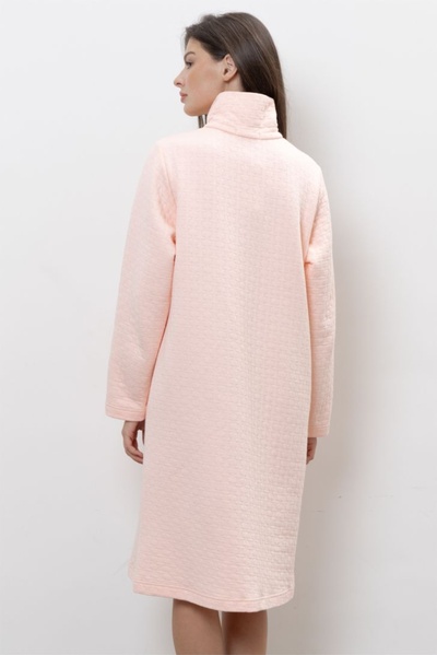 Халат со стеганным эффектом прямого силуэта на молнии. Рукав длинный, втачной. Высота воротника – стойки регулируется застежкой молнией. Молния с двумя бегунками на халате позволяет расстегивать замок не только сверху, но и снизу. Это удобно и предотвращает быструю поломку застежки. Халат декорирован накладными карманами.