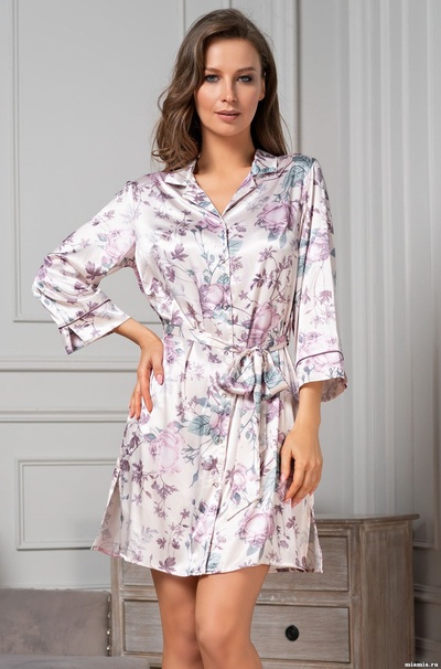 Халат-рубашка Mia-Amore с рукавом ¾. Изделие выполнено из принтованного смесового шелка. По бокам расположены карманы. Линию талии можно подчеркнуть за счет пояса.