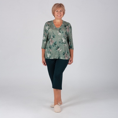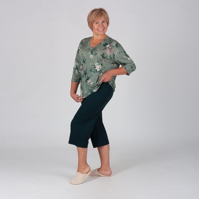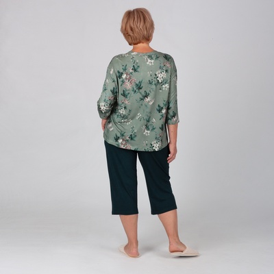 Трикотажный комплект с капри выполнен из набивного и гладкого трикотажного вискозного полотна. Джемпер с рукавом 3/4 и V-образным вырезом горловины, капри свободного кроя, не сковывают движения. Трикотаж мягкий и приятный к телу, не прозрачный, хорошо держит форму. Состав: Вискоза-96%, ПУ-4%.