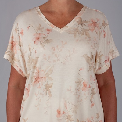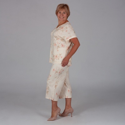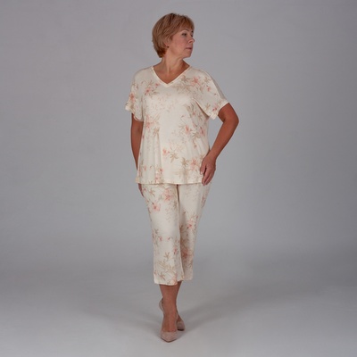 Женский комплект в нежных сливочных оттенках с утончённым цветочном принтом, создающий элегантную визуальную текстуру. Трикотажное шелковистое вискозное полотно высокого качества. Комплект состоит из джемпера и капри свободного кроя, не сковывает движений. V-образный вырез горловины визуально вытягивает силуэт, цельнокроенный рукав. Состав: Вискоза-96%, ПУ-4%.