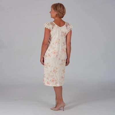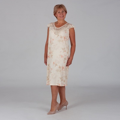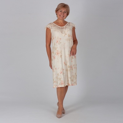 Сорочка свободного силуэта в нежных сливочных оттенках с утончённым цветочным принтом, создающим элегантную визуальную текстуру. Трикотажное шелковистое вискозное полотно высокого качества. В передней части лифа кружевная вставка. Состав: вискоза 96%, пу 4% + кружево.