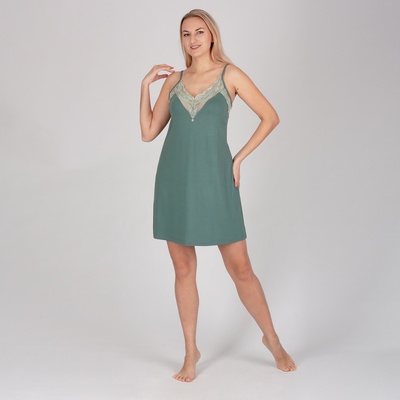 Короткая сорочка на тонких бретелях с регуляторами выполнена из шелковистого трикотажного вискозного полотна высокого качества. Мягкое биколорное кружево с легким блеском эффектно декорирует лиф и спинку. Украшение - подвеска. Длина сорочки на рост 164- выше колен. На фото рост модели -178 см.