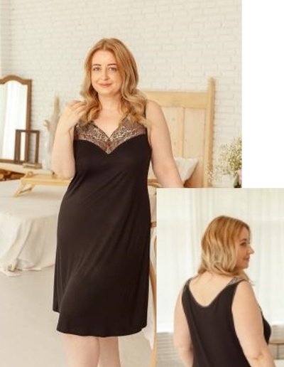 Элегантная сорочка прямого силуэта с отрезными чашками выполнена из трикотажного вискозного полотна. Лиф и спинка сорочки декорированы ажурным кружевом. Под линией подреза спереди сорочки расположена кружевная вставка.