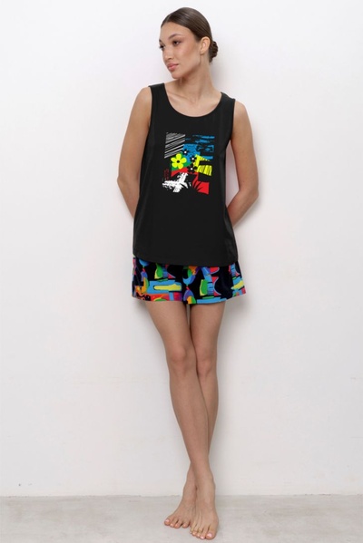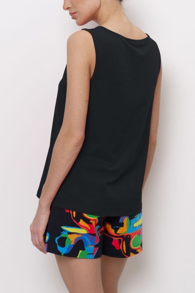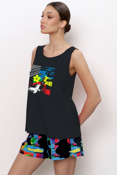 Топ на широких бретелях. Вырез горловины круглый. Модель декорирована тематическим принтом. Состав: Хлопок 95%, Эластан 5%.