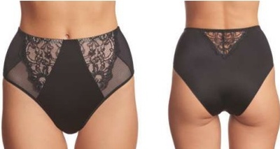 Трусы-слип, высокая линия талии плюс. Открытые по окату бёдра. Задняя деталь с клеевой обработкой. Материалы: неэластичное кружево, эластичное сетчатое полотно, эластичное трикотажное полотно.