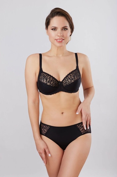 Бюстгальтер из эластичного полотна и трикотажного полотна, на каркасах. Мягкие чашки с двойным членением и боковой корректирующей деталью.