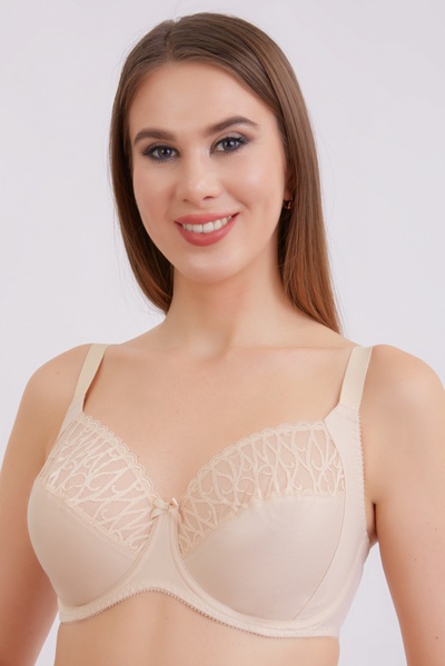 Бюстгальтер с мягкими чашками на каркасах. Выполнен из трикотажного полотна и эластичного кружева. С боковой корректирующей деталью.