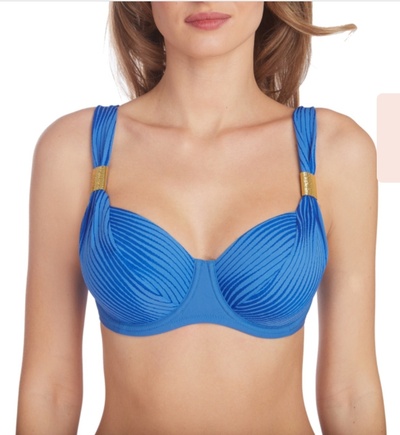 Бюстгальтер купальный, мягкие чашки на каркасах с двойным диагональным членением. Бретели отстёгиваются на спине.