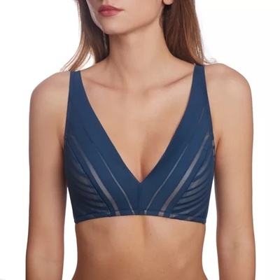 Дублированная чашка без каркасов на малые и средние полноты из эластичного полосатого кружева и эластичного трикотажного полотна. Чашка хорошо поддерживает форму груди и обеспечивает дополнительный комфорт благодаря хлопковой подкладке. Стан из эластичного трикотажного полотна с тактичным блеском.