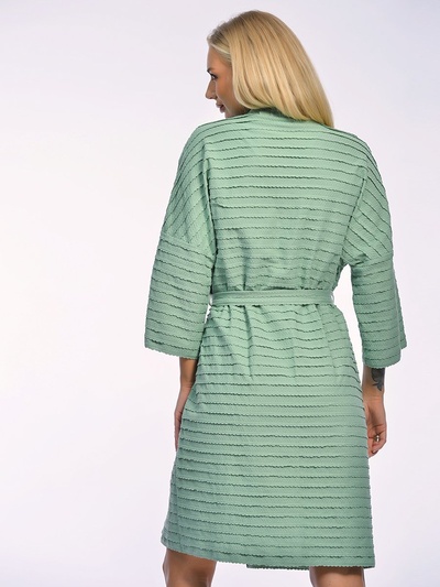Трикотажный халат-кимоно на запах выполнен из фактурного ажурного хлопкового полотна, что обеспечивает ему не только мягкость и приятные тактильные ощущения, но и долговечность. Благодаря натуральному составу материал легко пропускает воздух, дарит комфорт в любое время года и идеально подходит для ежедневного использования.