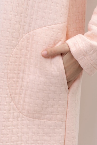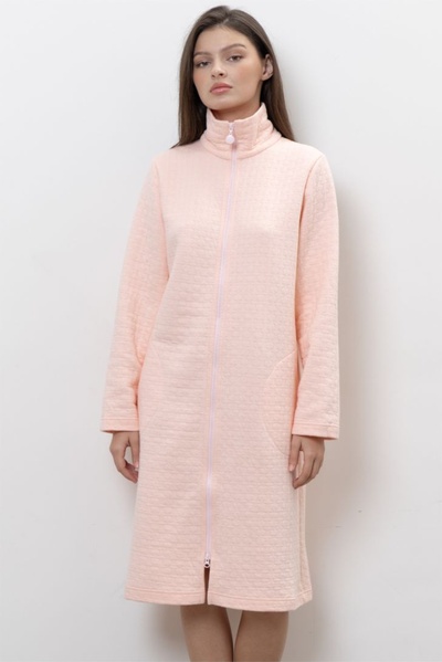 Халат со стеганным эффектом прямого силуэта на молнии. Рукав длинный, втачной. Высота воротника – стойки регулируется застежкой молнией. Молния с двумя бегунками на халате позволяет расстегивать замок не только сверху, но и снизу. Это удобно и предотвращает быструю поломку застежки. Халат декорирован накладными карманами.