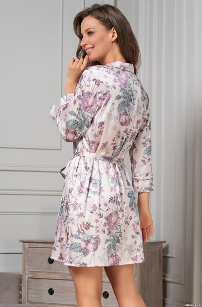 Халат-рубашка Mia-Amore с рукавом ¾. Изделие выполнено из принтованного смесового шелка. По бокам расположены карманы. Линию талии можно подчеркнуть за счет пояса.