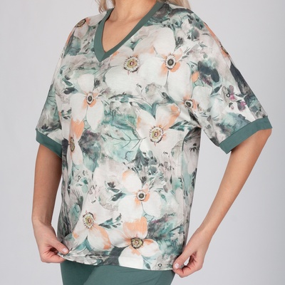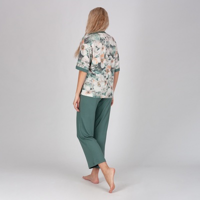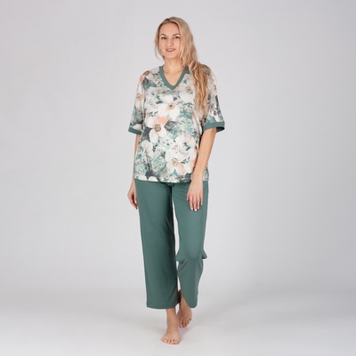 Брючный комплект выполнен из трикотажного шелковистого вискозного полотна с эффектными отделками по лифу и манжетами по цельнокроеному рукаву из набивного полотна. Джемпер с укороченным цельнокроенным рукавом до локтя. Брюки однотонные прямого кроя, пояс на широкой резинке. Трикотаж в комплекте высокого качества, мягкий, не прозрачный, приятный к телу. Комплект можно носить дома и на отдыхе, в нем можно спать и принимать гостей.