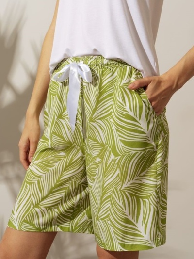 Шорты удлинённые свободного прилегания, пояс обработан резинкой и декорирован атласной лентой. Состав: вискоза 100%.