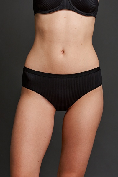 Трусы-слип, средняя линия талии плюс. Выполнены из эластичного трикотажного структурного полотна с рисунком в полоску. Нижние срезы выполнены с плоскими обработками. По верхнему срезу модель декорирована широкой тесьмой.