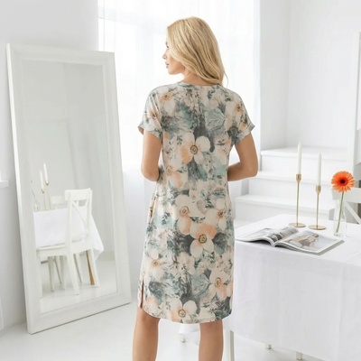 Туника - домашнее платье, выполнена из набивного трикотажного полотна. V-образный вырез горловины удлиняет образ, наличие карманов в боковых швах удобно и практично, разрезы внизу боковых швов добавляют комфорт.