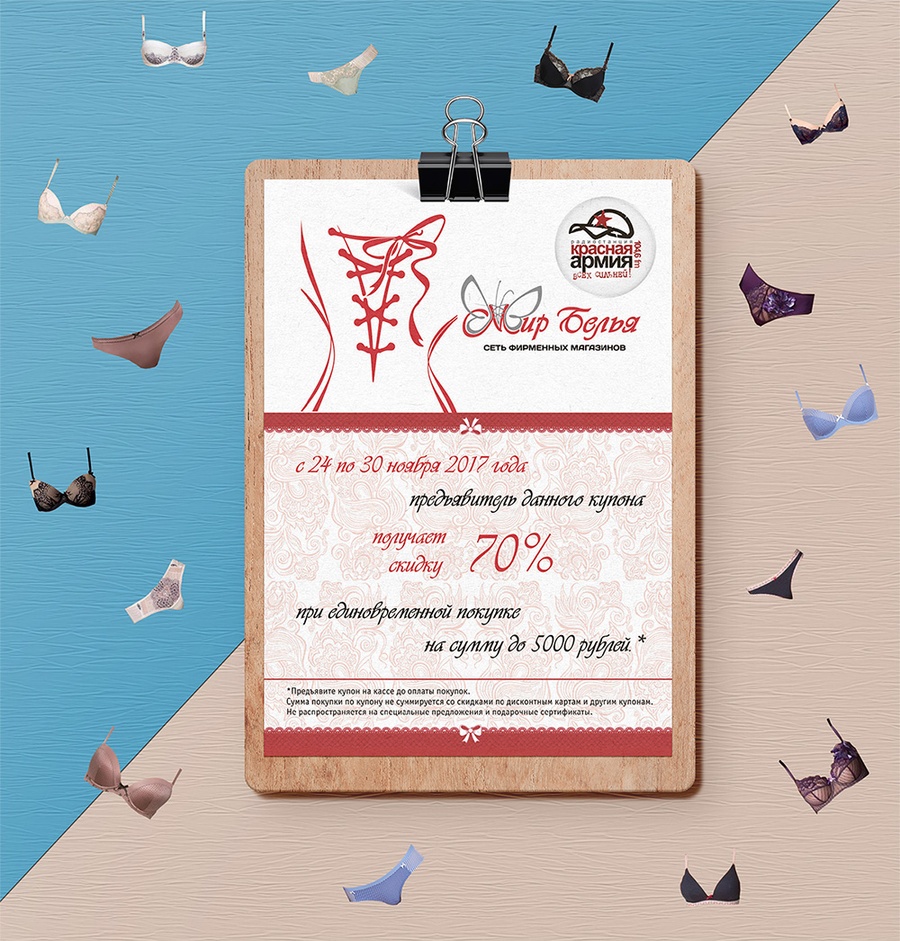 24 ноября дозвонись в шоу «Свежесть» или шоу «Знаменитости» на радиостанции «Красной Армии» и выиграй купон на покупку белья со скидкой 70% в сети магазинах «Мир Белья» и «Милавица»!