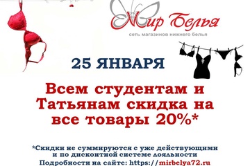 Компания «Мир Белья» поздравляет всех студентов и Татьян с этим замечательным праздником и дарит им скидку 20%!